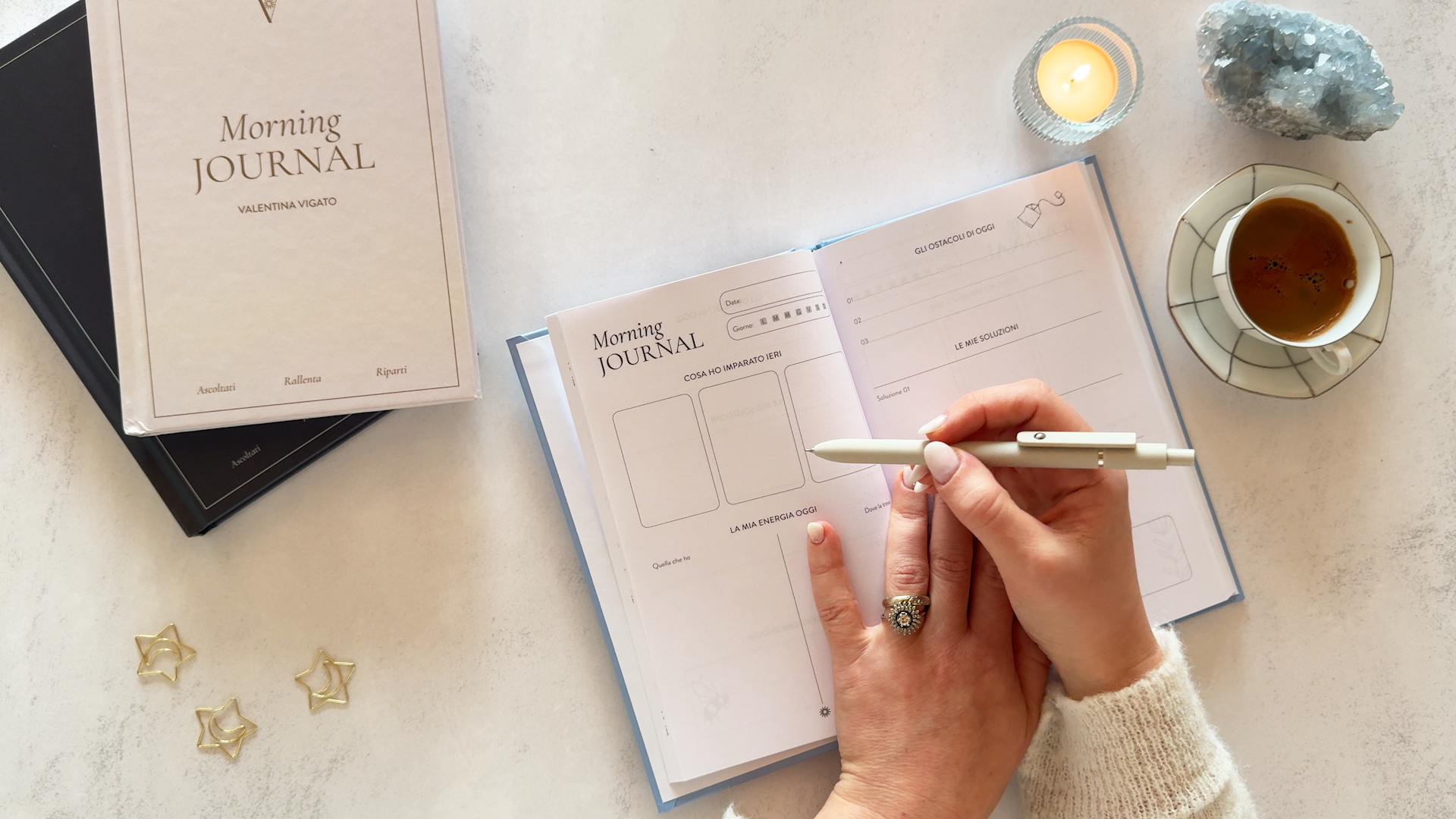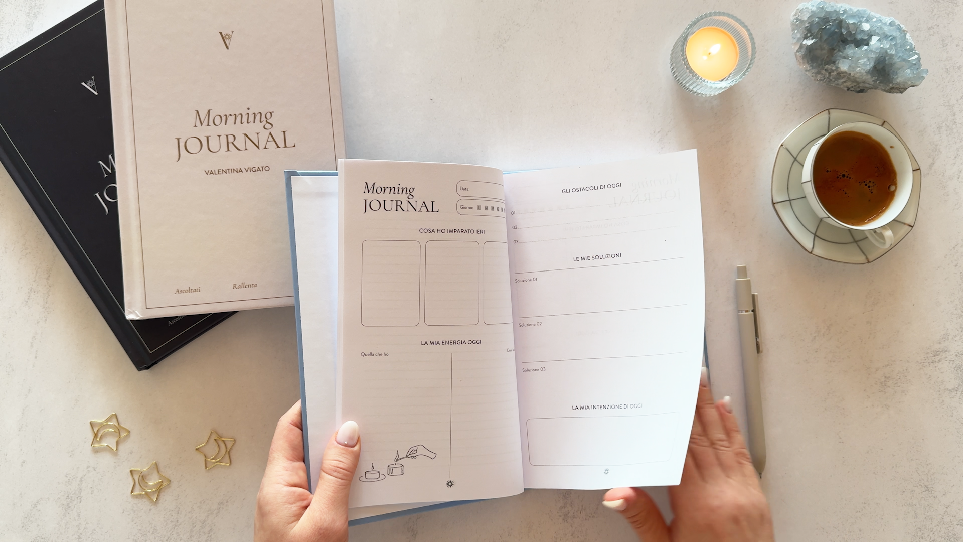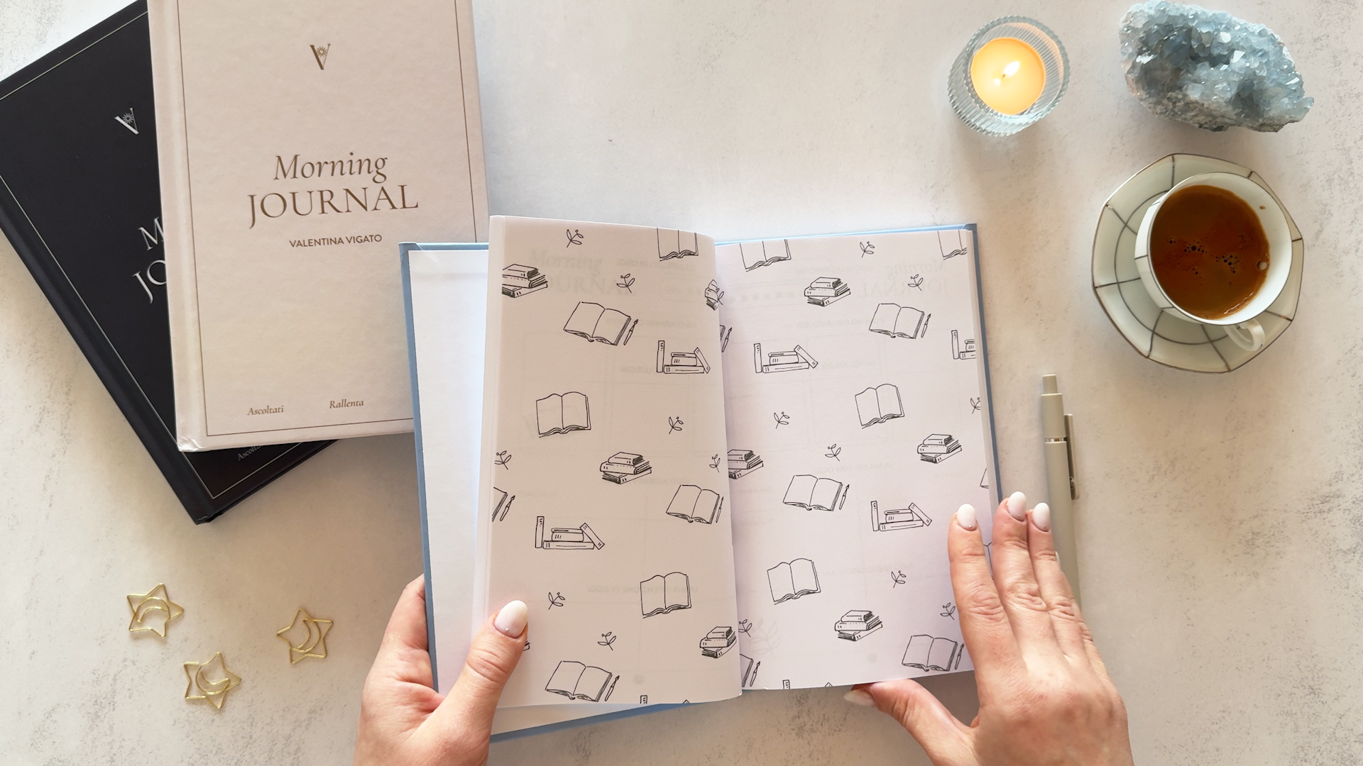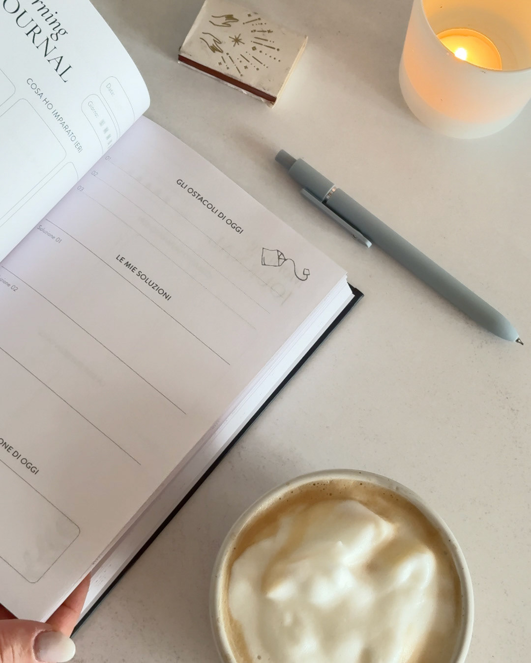I was asked to design an undated Morning Journal that supports mindful daily planning and encourages users to slow down, create space, and begin their day with clarity. In collaboration with professional organiser Valentina Vigato, we defined key content points and a visual direction centred on simplicity and breathing room. I refined the visual identity, developed page layouts, and created custom line illustrations and repeating patterns to invite moments of pause, reflection, and optional colouring throughout the journal. The outcome is a structured, undated journal combining functional guidance with calm visual storytelling. Spacious layouts, hand-drawn line artwork, and tactile design elements create an inviting tool for intentional morning routines.